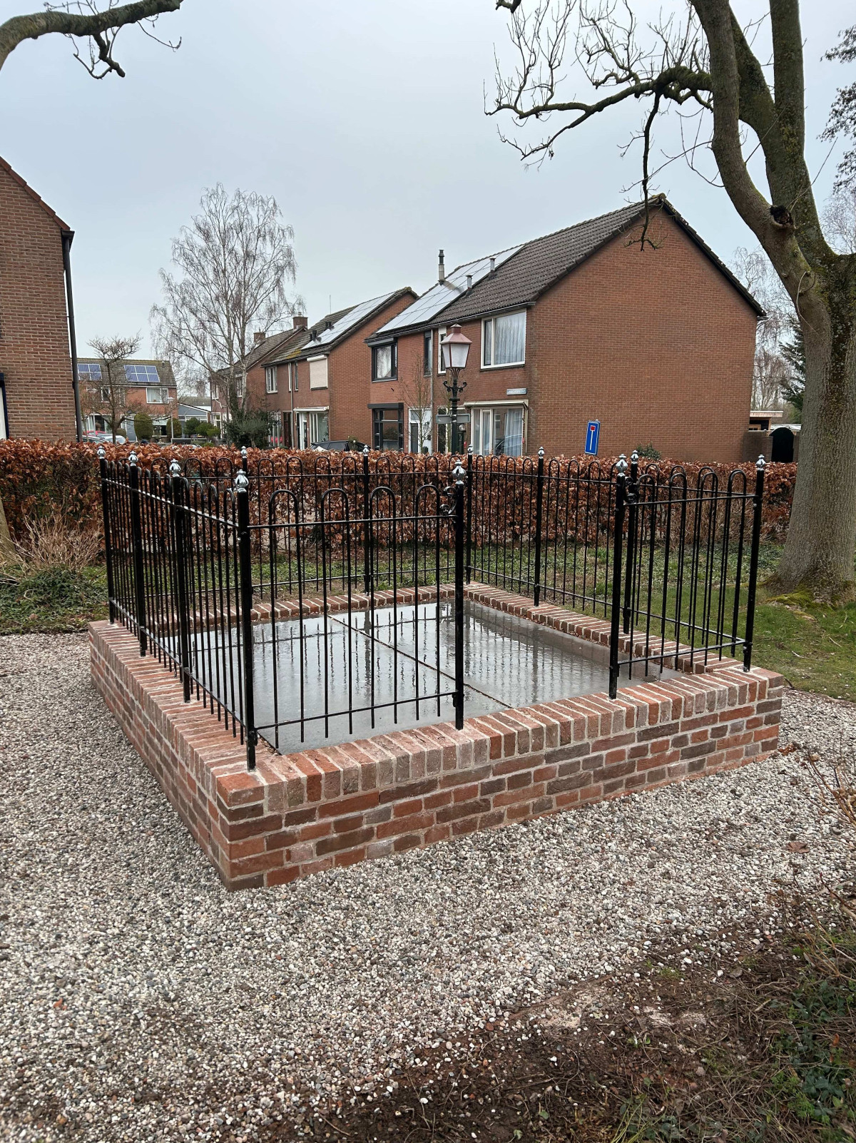 Rondom de grafkelder is een fundatiebalk ingegraven waarop het hekwerk geplaatst wordt, zodat het geheel niet kan verzakken.